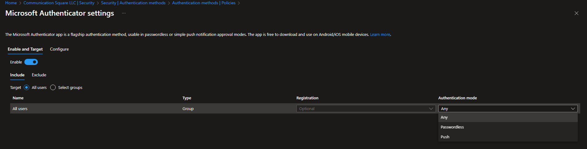 - This is where you'll manage authentication methods for the entire tenant, including passwordless options.